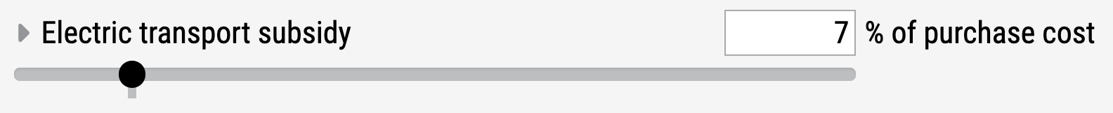 - Subsidize purchase costs. Increase the subsidy to the purchase cost of new electric vehicle sales or building and industry equipment sales with the main Electrification sliders, or in the advanced view by using the “Electric transport subsidy” or the “Electric equipment subsidy” sliders.