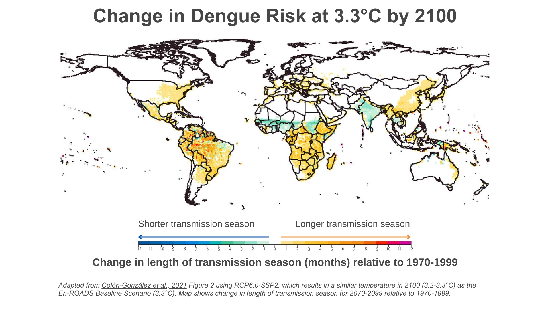 - The maps below shows the change in the length of the transmission season for malaria and dengue for the 2070-2099 period for a scenario similar to the En-ROADS Baseline Scenario. Blue colors show decreases in the length of the transmission season, while orange/pink colors show increases in the length of transmission season: